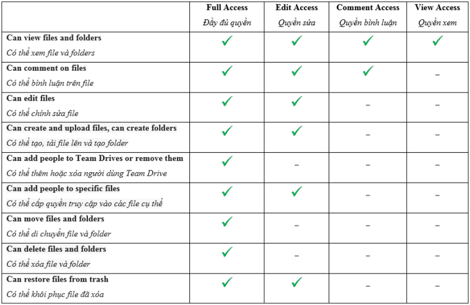 Trong tiện ích Shared Drives của Google Drive, các quyền truy cập được phân chia chi tiết như sau: