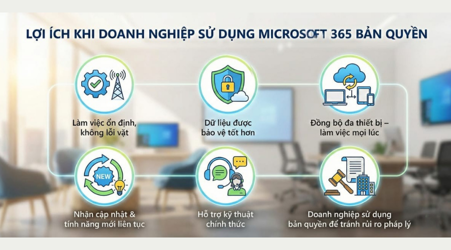 Sử dụng Microsoft 365 bản quyền không chỉ giúp doanh nghiệp hợp pháp, mà còn đảm bảo ổn định, an toàn và hiệu quả trong công việc hàng ngày. Với bản quyền chính hãng, bạn sẽ yên tâm: Office hoạt động mượt mà, dữ liệu được bảo mật tốt, đồng bộ trên mọi thiết bị, luôn cập nhật tính năng mới và được hỗ trợ kỹ thuật chính thức khi cần.