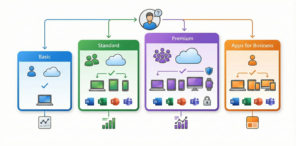 Yêu cầu bảo mật, quản lý thiết bị → Business Premium. Nhìn vào nhu cầu thực tế giúp tránh mua gói “thừa thãi” mà vẫn đầy đủ công cụ cần thiết.