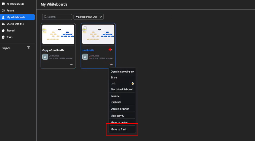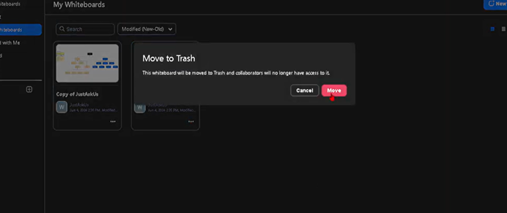 ⚠️ Lưu ý: Whiteboard đã xóa thường không thể khôi phục, hãy cân nhắc trước khi thực hiện.